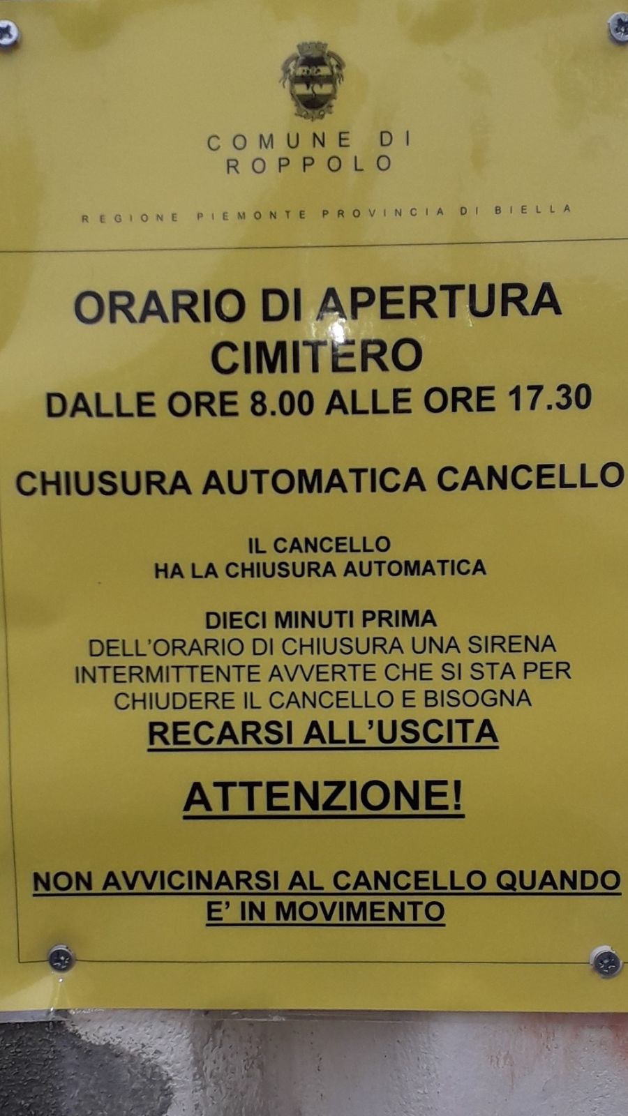Si comunica che è stata messa in funzione la chiusura automatica dei cancelli dei cimiteri di Roppolo Piano e Castello.